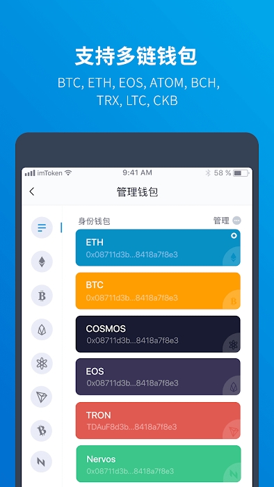 轻松管理 BTC, ETH, EOS, ATOM, BCH, TRX, LTC, CKB, DOT, KSM, FIL, XTZ.